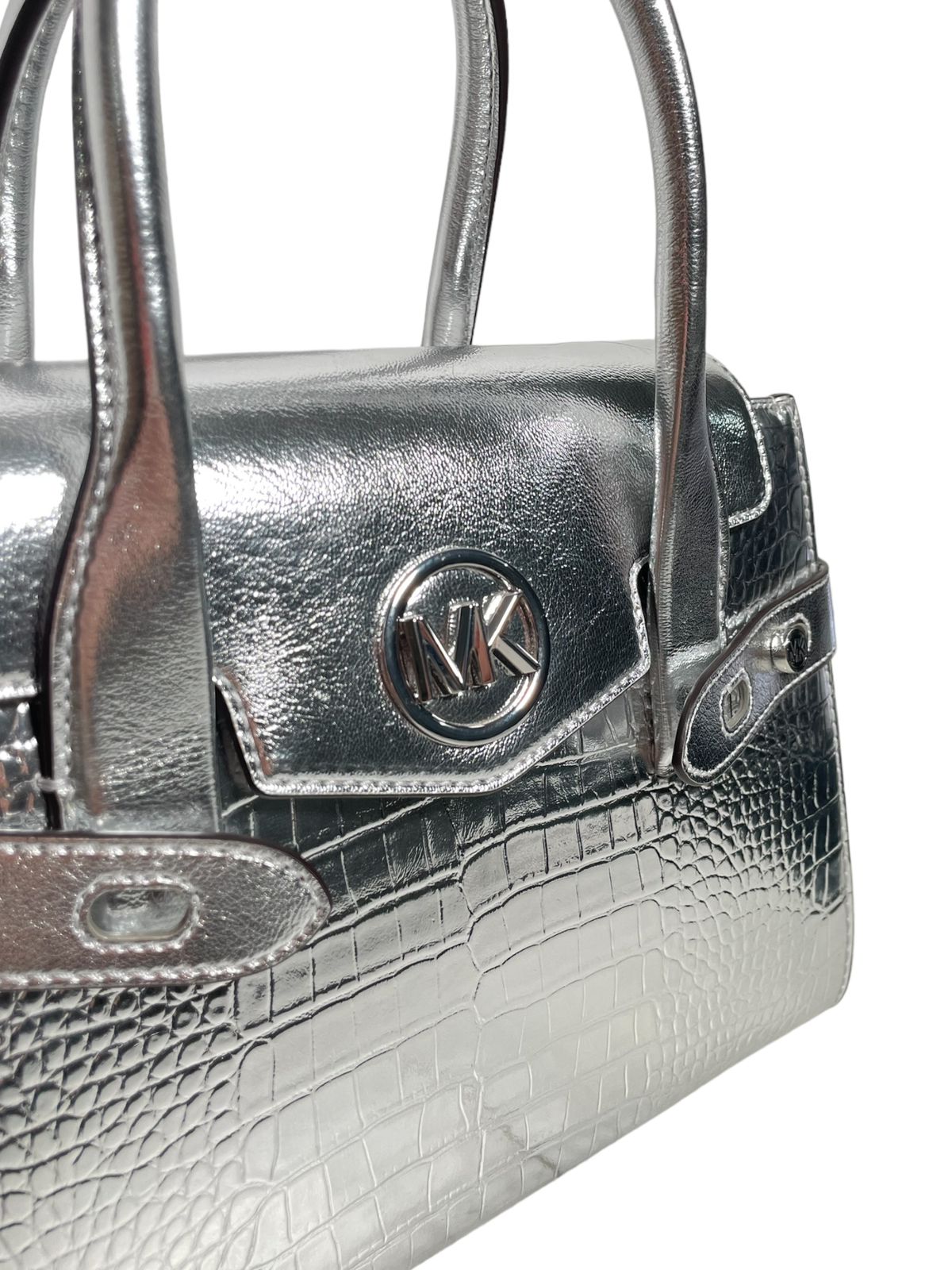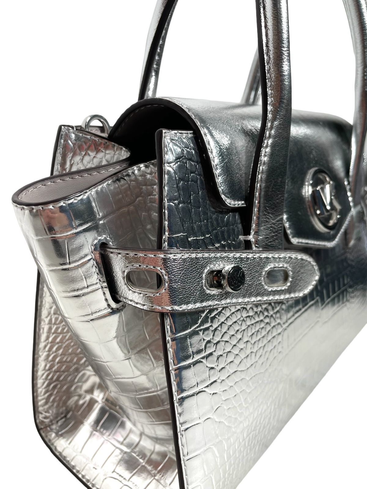 - Diseño Exclusivo: El bolso Michael Kors plateado presenta un diseño moderno y elegante que captura la atención con su acabado plateado brillante y su forma refinada.