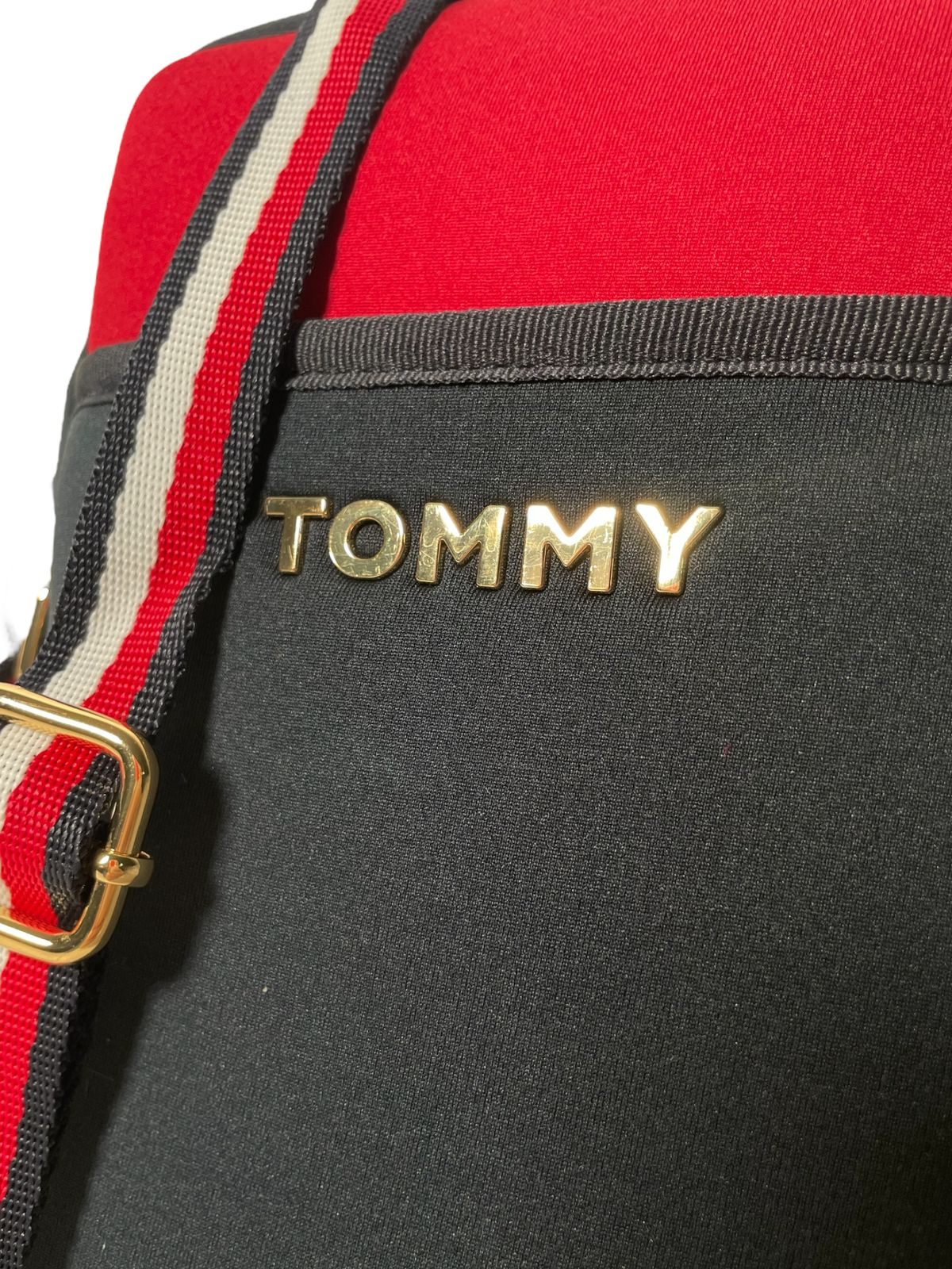 - Logo de Tommy Hilfiger en relieve en la parte frontal de la bolsa.
